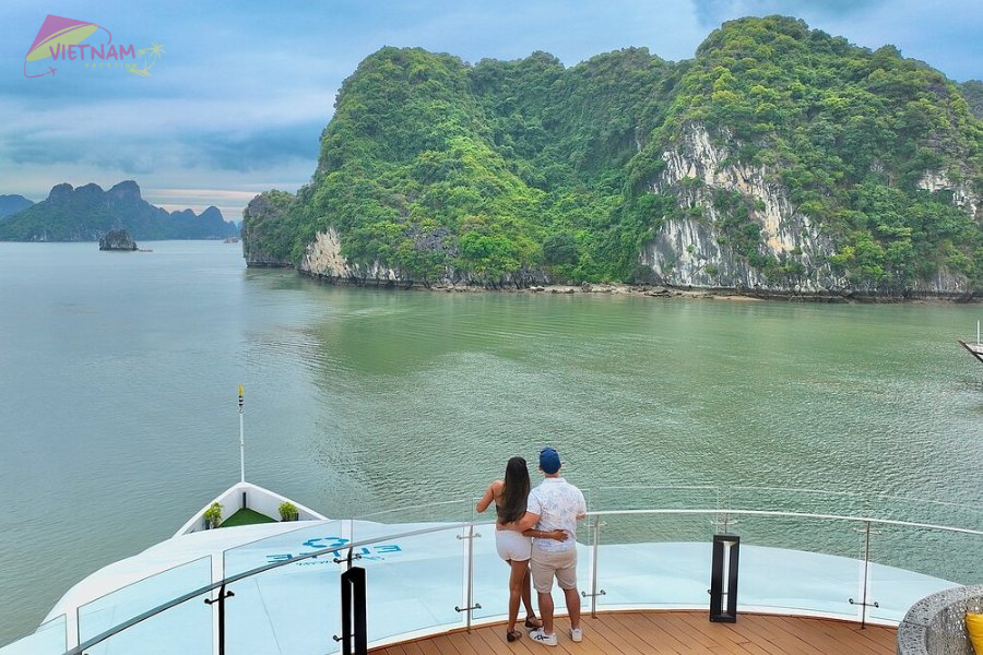 Ha Long Bay is recognized by UNESCO as a World Natural Heritage because of its beautiful natural scenery. Coming here, tourists can take a cruise to have the fresh seafood and admire the limestone mountains covered with green moss, clear blue water, and fresh air.