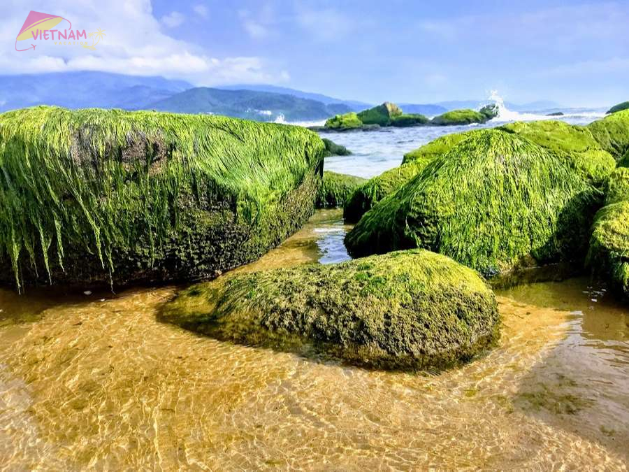 At low tide, the mossy rocks reveal, creating an irresistible beauty. Thus, don’t hesitate to take out your phone or camera to take the most beautiful photos!