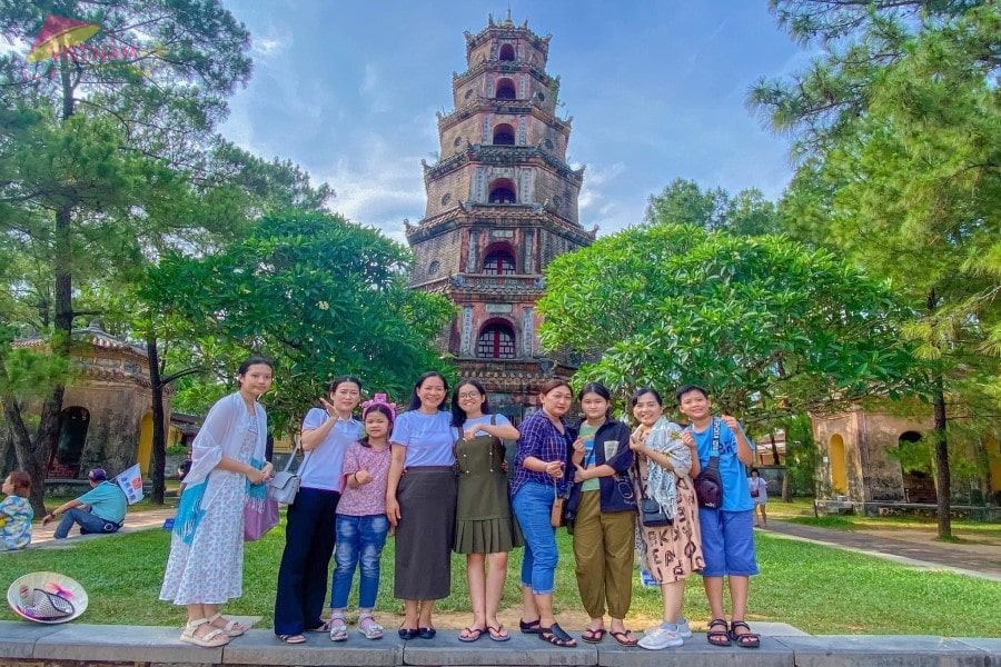 When standing on the top, you will see the panoramic vista from Vong Canh Hill with rolling hills, lush foliage, and the iconic Thien Mu Pagoda in the distance. It is a place of tranquility and inspiration, where visitors can bask in the gentle breeze, marvel at the stunning sunset, and find solace amidst the breathtaking scenery.